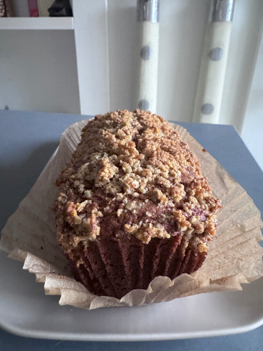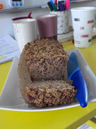 A cozy, not overly sweet cake. Used my homemade apple sauce, dried apple skins, vanilla, cinnamon, nutmeg and cloves for the natural sweetness and warmth touch. Topped with a walnut crumble for the extra mile in texture and flavor.