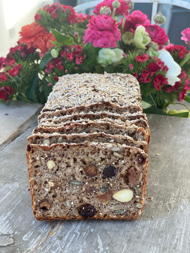 A big wholemeal sourdough tin loaf (over a kilo in size) made exclusively with rye and whole-wheat flour. High in protein and fiber, delicious and filling!