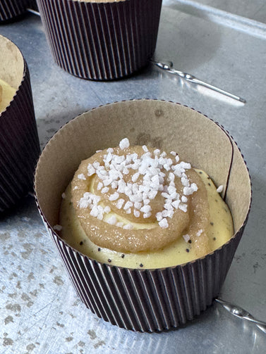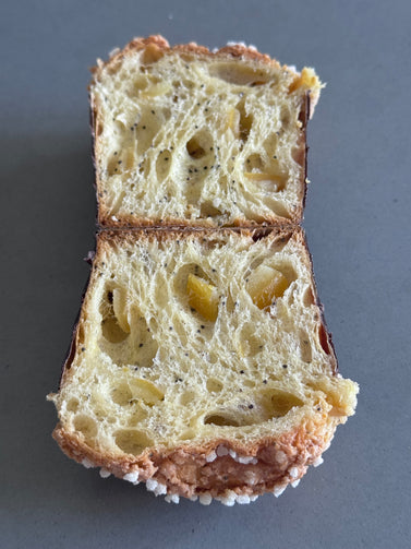 The flavor is fully aromatic, luscious and luxurious! White chocolate, candied lemon and lemon paste, limoncello infused poppyseeds. Despite being so rich it feels fresher and lighter. The texture is creamy light and fluffy. Glazed with an almond paste and sprinkled with pearl sugar. I make from scratch my own candied lemons and paste. I use fresh yolks, fresh vanilla beans and real butter.