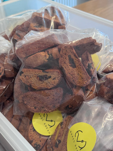Ingredients: wheat flour, rye, oil, fresh orange juice, zest, cinnamon, cardamon, raisins, b.soda/power, sourdough, sugar, vanilla, salt